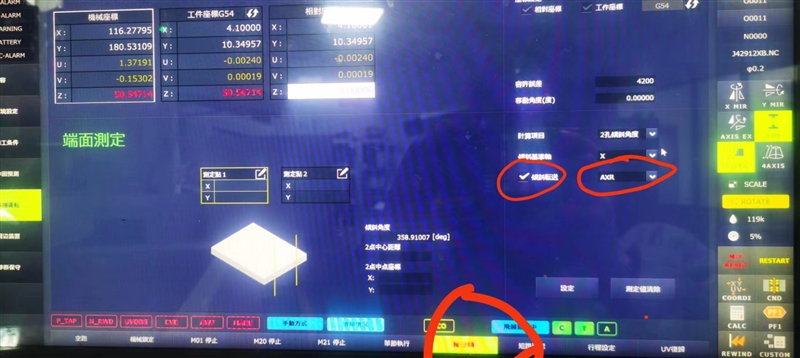 西部M50B,模板怎么轴旋转? 1.轴旋转功能打开 2.倾斜运送打勾 3.右边选择AXR 4.测定点1打工件负方向,测定点2打工件正方向,无论基准轴是X或Y。 5.打好两点后,按一下设定,轴旋转功能字体由红色变黑色,表示角度已打好
